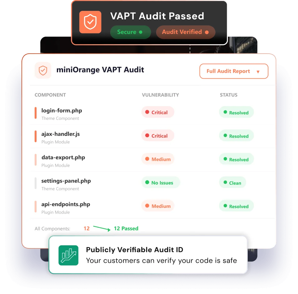 Audit the custom themes and plugins you build for clients. Deliver a miniOrange Audit ID as part of your project handoff — turning security into a billable, client-facing deliverable.